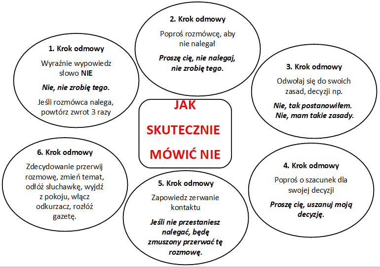 Umiejętność odmawiania wchodzi w zakres asertywności czyli umiejętności wyrażania siebie, swojego zdania i emocji z poszanowaniem praw i uczuć osób, do których się zwracamy i swoich własnych. Nie potrafisz powiedzieć nie gdy ktoś, prosi cię o coś, a ty z jakichś powodów nie możesz czy nie chcesz tego zrobić? Wczytaj się w poniższy schemat.